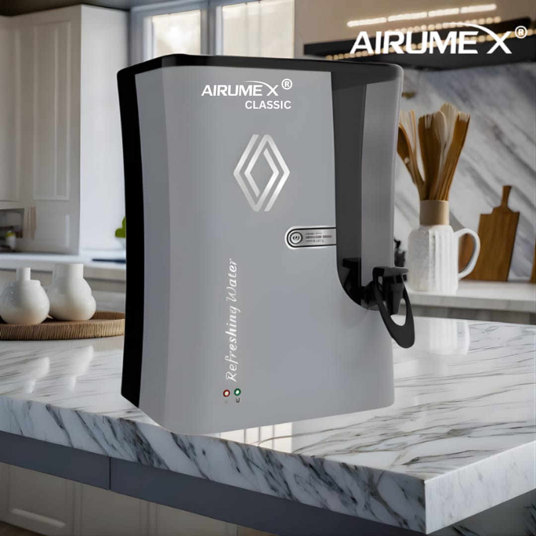 Revitalize your daily routine with the AIRUMEX CLASSIC, a timeless 9L storage water purifier that infuses essential minerals for optimal wellness. Powered by 7-stage purification—Reverse Osmosis (RO), Mineral (MIN) enrichment, Ultra Violet (UV) purification, Ultrafiltration (UF), TDS Controller, Sediment, Carbon, and Spun filters—it provides clean, nutrient-boosted water free from impurities. Built with 100% food-grade plastic in elegant Black, White, Golden, or Blue hues, this sleek 5KG design (46cm H x 36cm W) fits seamlessly with wall-mount or tabletop installation and a low-voltage 24V operation.